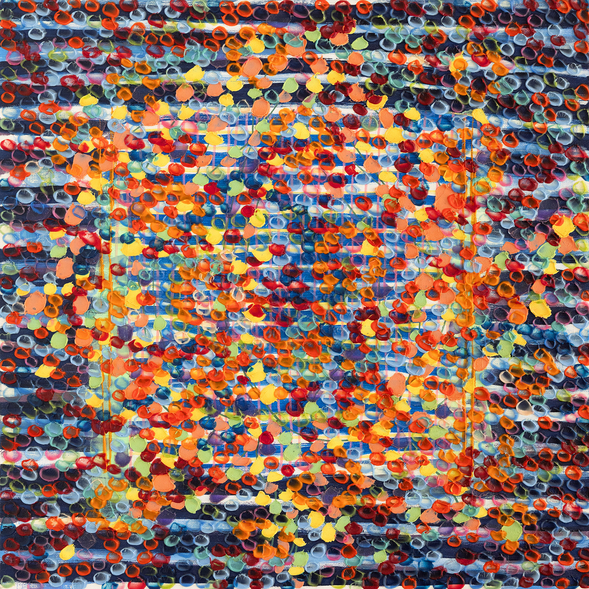 Through its stripes of linen canvas assembled onto the canvas panels, revokes and reveals with playful intend a transformation of PIXEL Impressionism